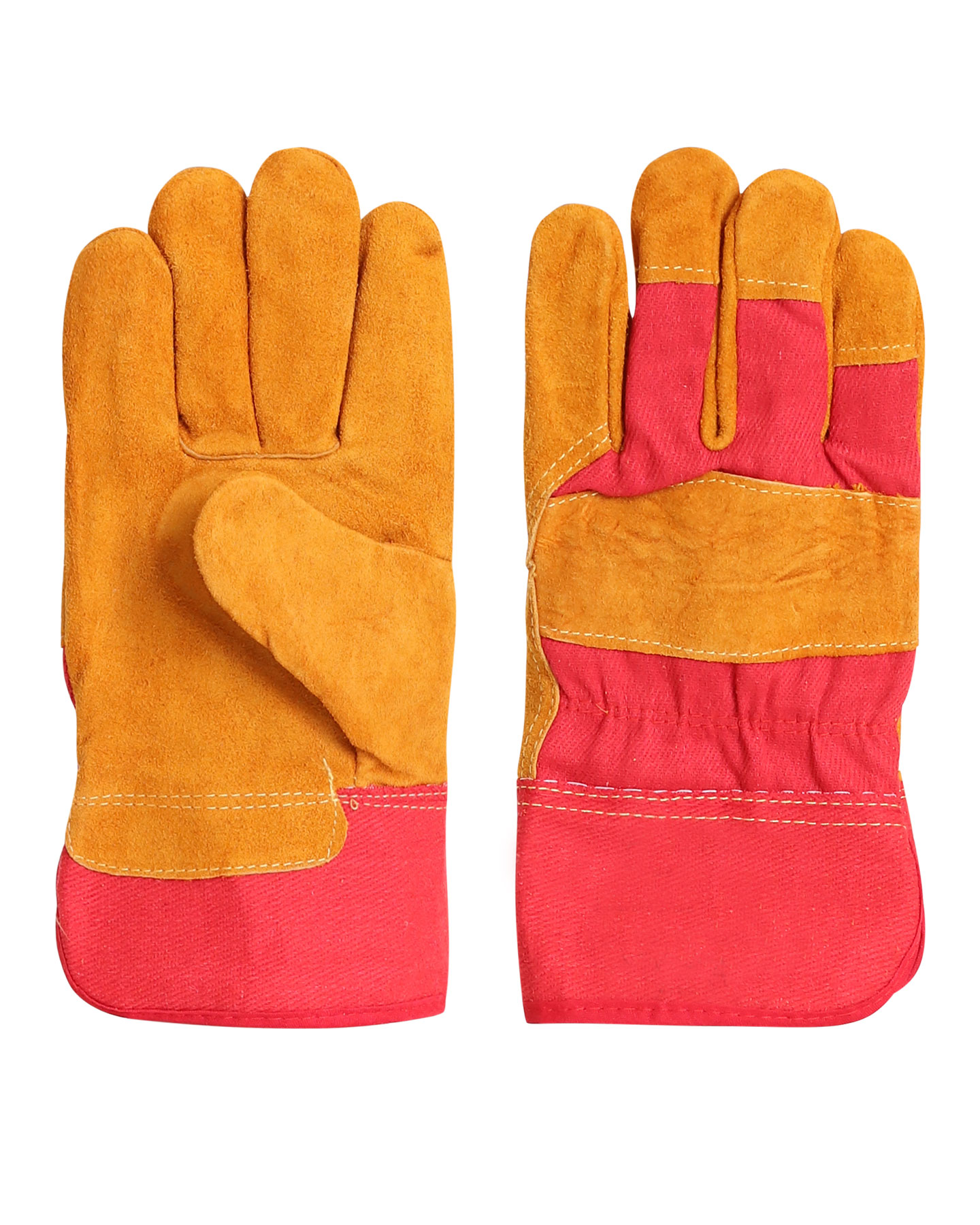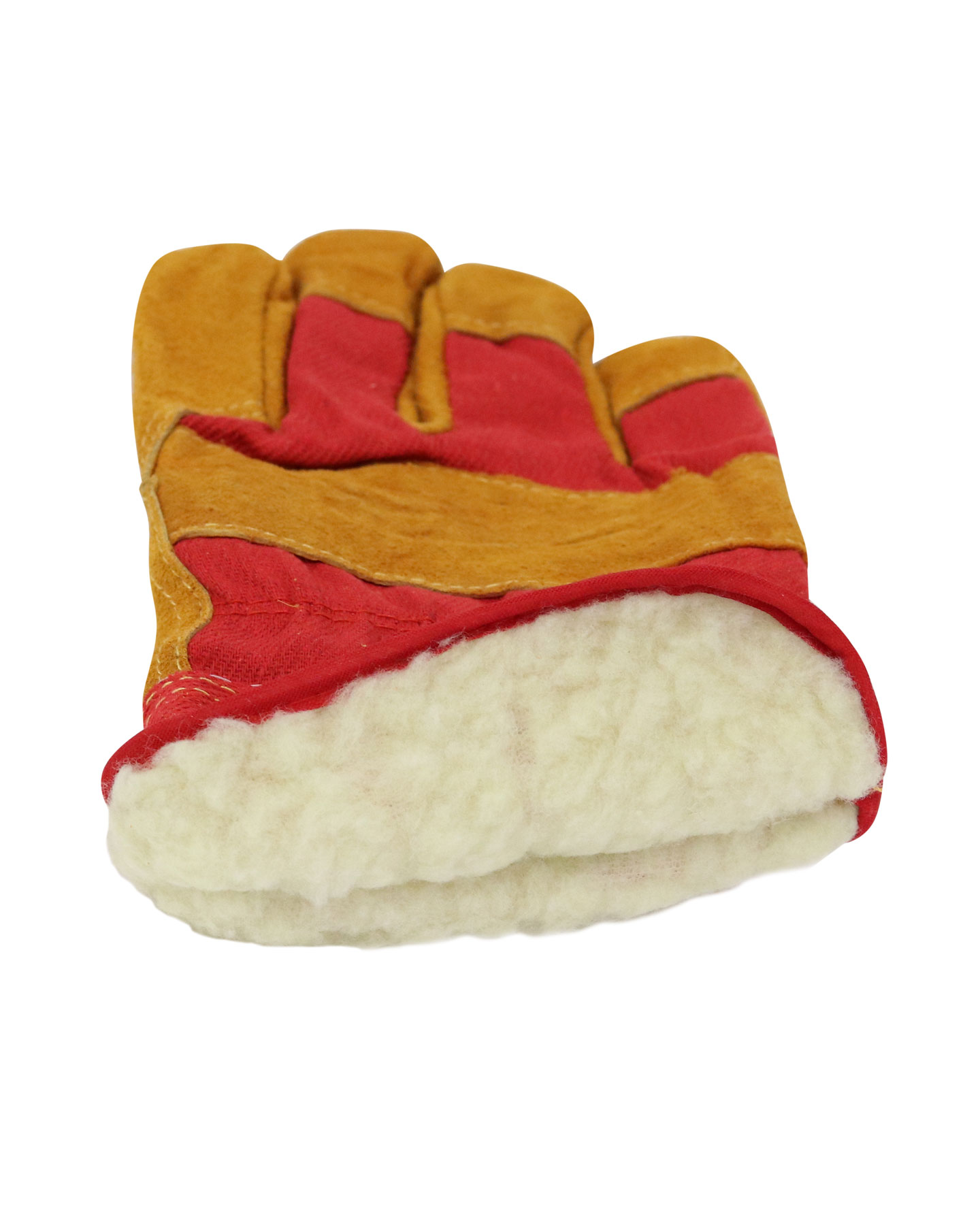 Перчатки комбинирванные, плотная смесовая ткань красного цвета со спилком желтого цвета, усиленная жесткая крага, утеплитель — искусственный мех белого цвета. Мягкий спилк 1,3 мм, двойные швы. Высокая стойкость к истиранию и разрыву, ограниченная защита от пореза и прокола.